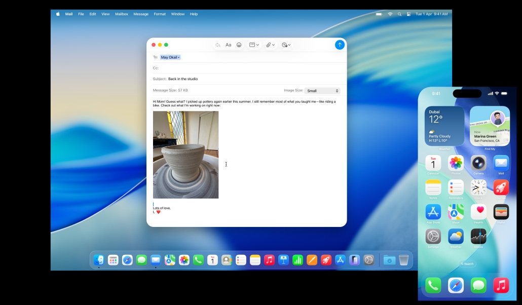 iPhone Mirroring lets you see and use your iPhone right from your Mac.4 So even if your phone is getting charged across the room, you can still access all your favorite iPhone apps. Live Activities from your iPhone also appear on your Mac. So when timely events occur, you don’t have to reach for your phone to stay in the know. You can even drag and drop a video from your Mac to your iPhone, so you can continue editing on the go.