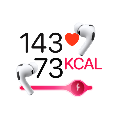 • Als je AirPods Pro 3 of Powerbeats Pro 2 gebruikt met Fitness+, zie je in real time je persoonlijke meet­waarden op het scherm, zoals je hartslag en je verbrande calorieën tijdens je work‑out. Deze waarden kun je ook zien als je een hartslag­meter van een andere fabrikant draagt die met je device is verbonden.1