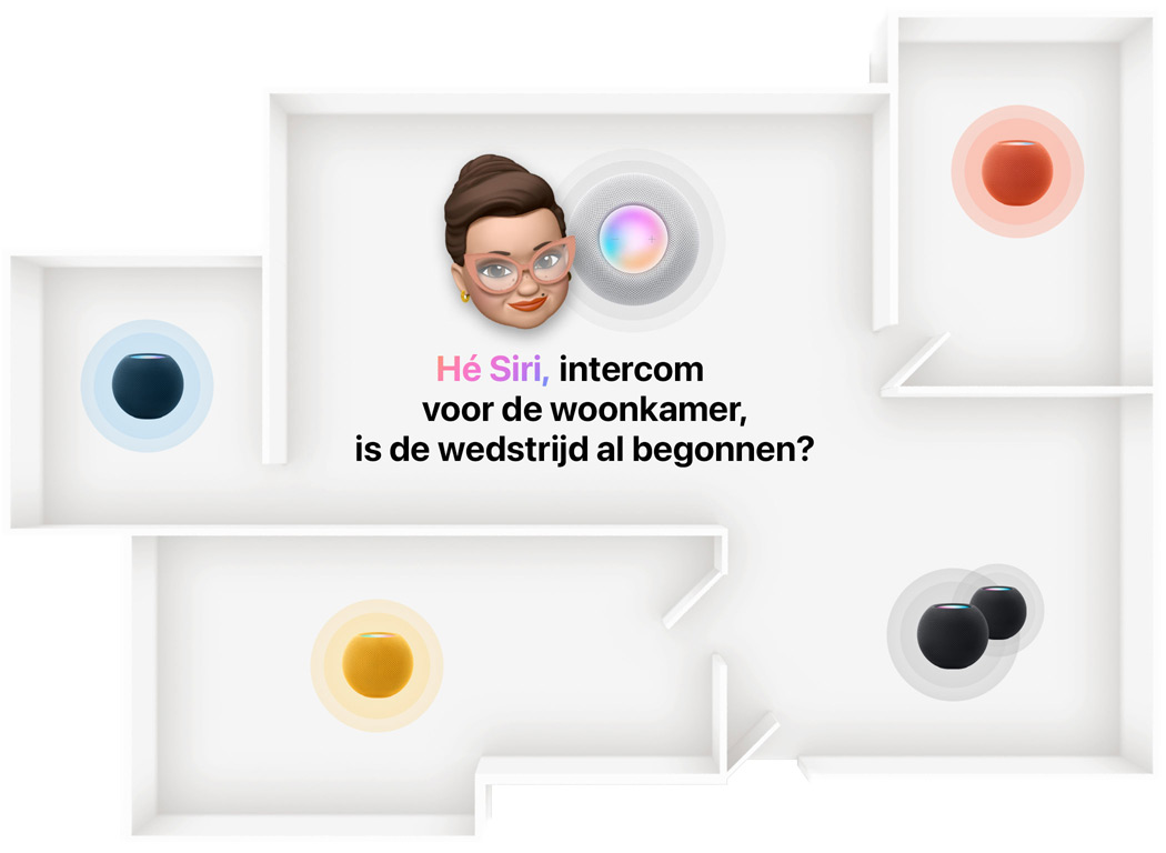 Zo wordt HomePod mini de spil van het gezin. Als je meerdere HomePod mini-speakers in huis hebt staan, kun je overal iets aan Siri vragen. En in combinatie met je iPhone en AirPlay bieden HomePod mini en Siri allerlei extra mogelijkheden. Start bijvoorbeeld een AirPlay-sessie vanaf je iPhone. Of vraag HomePod mini om de audio van een app op je iPhone te laten horen. Allemaal gewoon met je stem.6