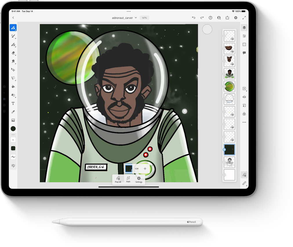 iPad Pro and Apple Pencil. Apple technology powers Mance’s digital art canvas. iPad’s versatility makes it perfect for illustrating, presenting, and teaching — while Apple Pencil’s precision and natural feel enable Mance to seamlessly instruct how to draw and paint inspirational characters with the Adobe Fresco app.