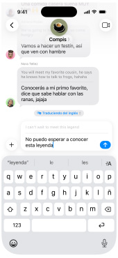 Activa Traducción en Tiempo Real para traducir textos automáticamente en Mensajes,1 subtítulos en vivo en FaceTime y llamadas en voz alta en Teléfono.2