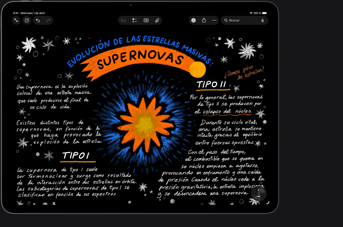 El Apple Pencil se ha convertido en un referente a la hora de dibujar, pintar, escribir y tomar notas. Cada gesto es intuitivo, preciso y casi mágico. Su trazo es inmediato, su precisión es milimétrica, detecta la inclinación y no pasa nada si apoyas la mano en la pantalla. Y con el Apple Pencil Pro tienes aún más funciones para hacer despuntar tu talento.2