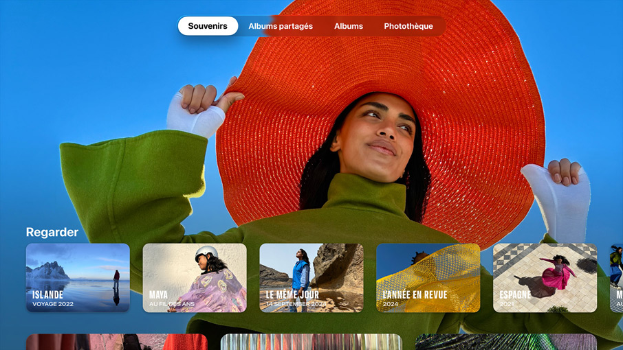 Photos. Grâce à la photothèque partagée iCloud, les photos de toute la famille sont regroupées au même endroit, et vous pouvez en profiter directement sur votre télé. Vous pouvez aussi sélectionner Souvenirs comme économiseur d’écran pour revivre vos plus beaux moments sur grand écran.