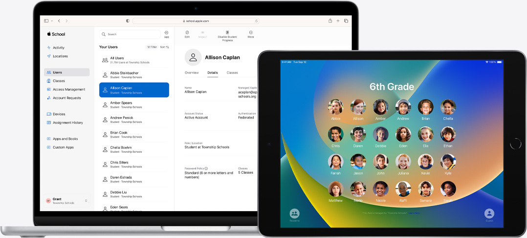 Apple 科技,設計直覺化,方便 IT 主管,以至每個人使用。有了 Apple School Manager,IT 人員無需實際接觸裝置,就能透過零接觸部署將裝置登記至流動裝置管理 (MDM) 中。靈活的部署方案可大規模支援個人裝置、共享 iPad、Mac 實驗室和 Apple TV。