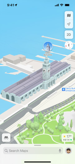 Get a whole new perspective on select major metro areas with photo‑realistic, immersive 3D views. Move your iPhone or iPad through space to experience a city from above, or take a closer look at cities and their landmarks in high resolution as you zoom, pan, tilt, and rotate. It’s exploration elevated.