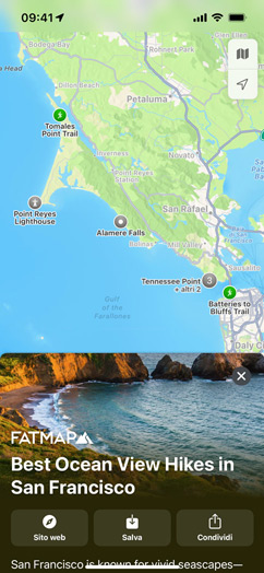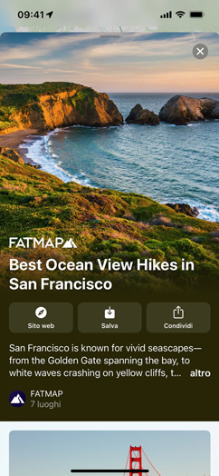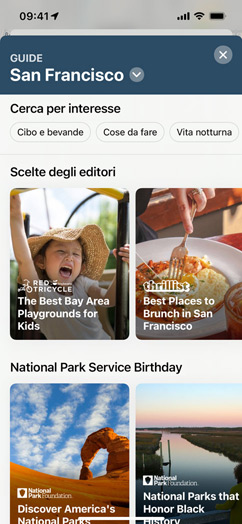 Le guide sono elenchi di luoghi selezionati da partner di fiducia per aiutarti a scoprire ristoranti, negozi, luoghi d’interesse e meraviglie nascoste. Mappe offre oltre 1000 guide per varie città del mondo. In Mappe su iOS 15, tocca “Esplora le guide” per vedere quelle consigliate dalla redazione.
