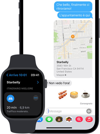 Goditi un’esperienza fluida e perfettamente integrata su tutti i dispositivi Apple che usi per muoverti. Il feedback aptico su Apple Watch ti guida nella direzione giusta, così non devi tirare fuori l’iPhone mentre cammini. Gli avvisi del calendario sul Mac ti segnalano quando è ora di smettere di lavorare e partire. Basta chiedere e HomePod ti dà l’itinerario che ti serve e lo invia al tuo iPhone mentre stai uscendo. E grazie alla sincronizzazione automatica di Mappe con Siri, Spotlight, Messaggi e Meteo, hai sempre le informazioni più adatte al momento giusto.