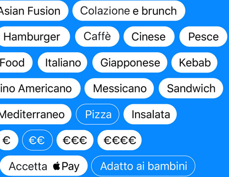 In Mappe trovare il posto giusto è facile e veloce. Usa filtri specifici per cercare un ristorante in base al tipo di cucina e alla fascia di prezzo, oppure per vedere solo quelli che offrono il servizio da asporto o che sono aperti in quel momento. Per ampliare la ricerca, basta spostare la mappa e i risultati si aggiorneranno in automatico. Cerchi qualcosa di più vicino a casa? Tocca “Trova nei dintorni” per avere un elenco di ristoranti, stazioni di servizio, hotel, bar, fast food, supermercati e centri commerciali vicini a te: i segnaposto colorati che vedrai apparire sulla mappa ti aiuteranno a scegliere il posto giusto.