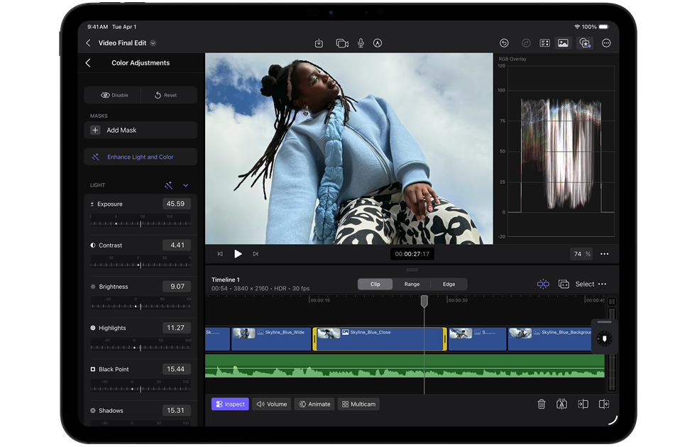 Du kannst Smart HDR Bilder und bis zu 4K ProRes Video aufnehmen und bearbeiten, grössere 3D Szenen öffnen und editieren und komplexere KI Modelle ausführen, alles mit Pro Apps.