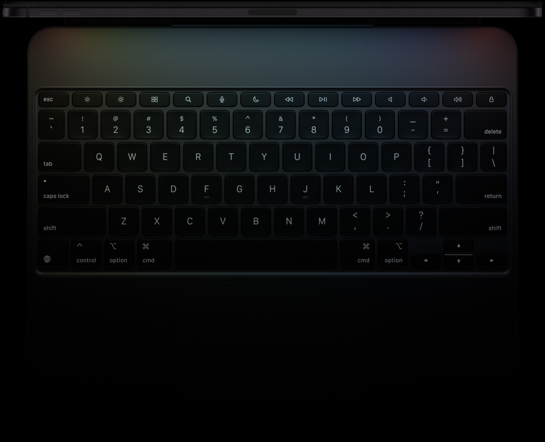 Das Magic Keyboard hat ein elegantes, mobiles Design mit einer Handauflage aus Aluminium und bietet ein fantastisches Tipp‑ und Trackpad-Erlebnis.12 Die Tastatur verfügt über eine Reihe mit Funktionstasten und ein grösseres Trackpad aus Glas mit haptischem Feedback für präzises Arbeiten und Multi-Touch Gesten.