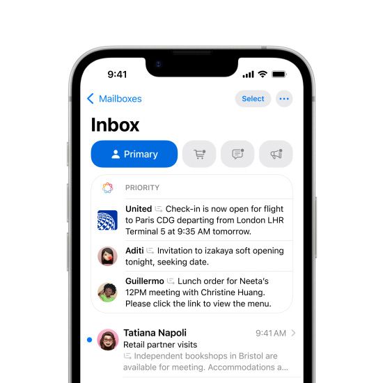 Priorisierte Nachrichten in Mail zeigen dringende Nachrichten im Posteingang ganz oben an – wie eine Einladung, für die du am selben Tag zusagen müsstest, oder die Erinnerung an den Check‑in für deinen Flug am Nachmittag.