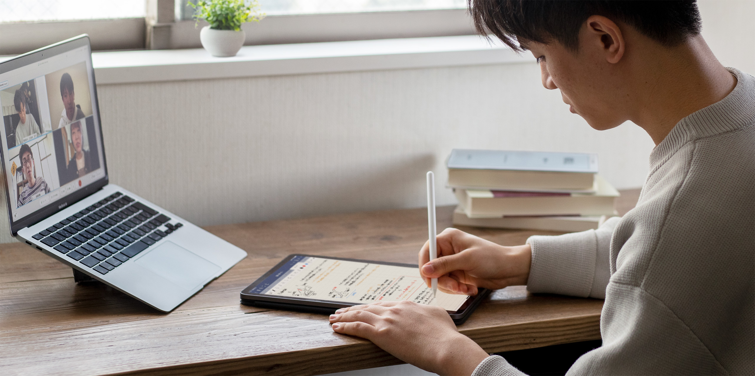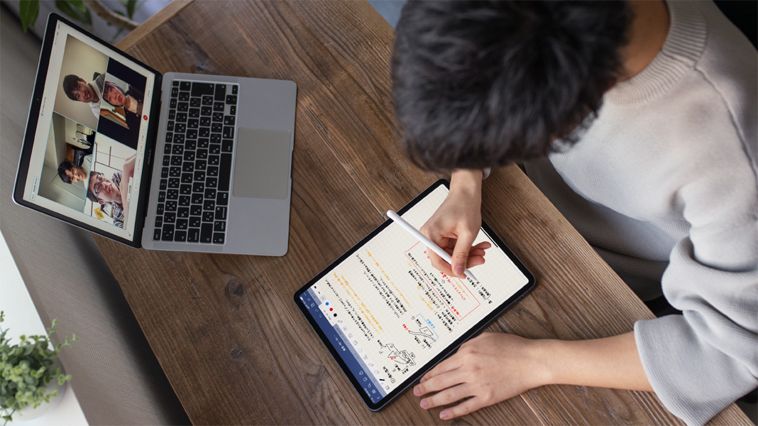 Como otros estudiantes, Takuto se adaptó al aprendizaje a distancia aprovechando las ventajas de los últimos avances tecnológicos. Durante las clases online, usó Pantalla Dividida en el iPad para ver la presentación del profesor de un lado y tomar apuntes del otro. Y cuando estudiaba en grupo de forma virtual, Takuto usaba FaceTime en la Mac para comunicarse con sus compañeros y, al mismo tiempo, el iPad como lienzo inmersivo para ilustrar los proyectos.