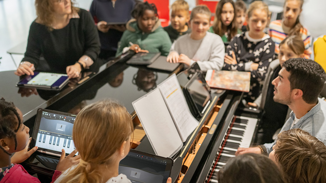 Que los maestros integren a sus clases estos nuevos métodos de aprendizaje tiene un impacto muy positivo para el progreso académico. En las clases de música, por ejemplo, los alumnos se sientan alrededor de un piano para tocarlo y hasta componen su propia música usando Pages y el Apple Pencil. Otros crean y graban en GarageBand sus propios sonidos en concierto junto con sus compañeros que tocan algún instrumento. En las clases de programación, usan CoSpaces Edu en el iPad para diseñar objetos en 3D y Swift Playground para hacer animaciones en entornos de realidad aumentada y realidad virtual.