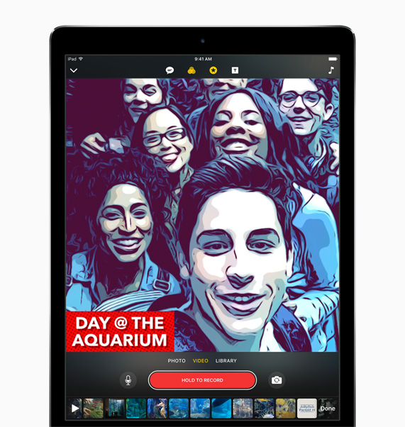 Clips lets users create multi-clip videos on iPhone or iPad without timelines, tracks or complicated editing tools. Touch and hold a single button to shoot live video and photos, or add them from the Photo Library. Then add artistic filters, speech bubbles, shapes or emoji. Users can also add full-screen posters with animated backgrounds and customizable text. Clips has dozens of music soundtracks to choose from, and they automatically adjust to match the length of a video.