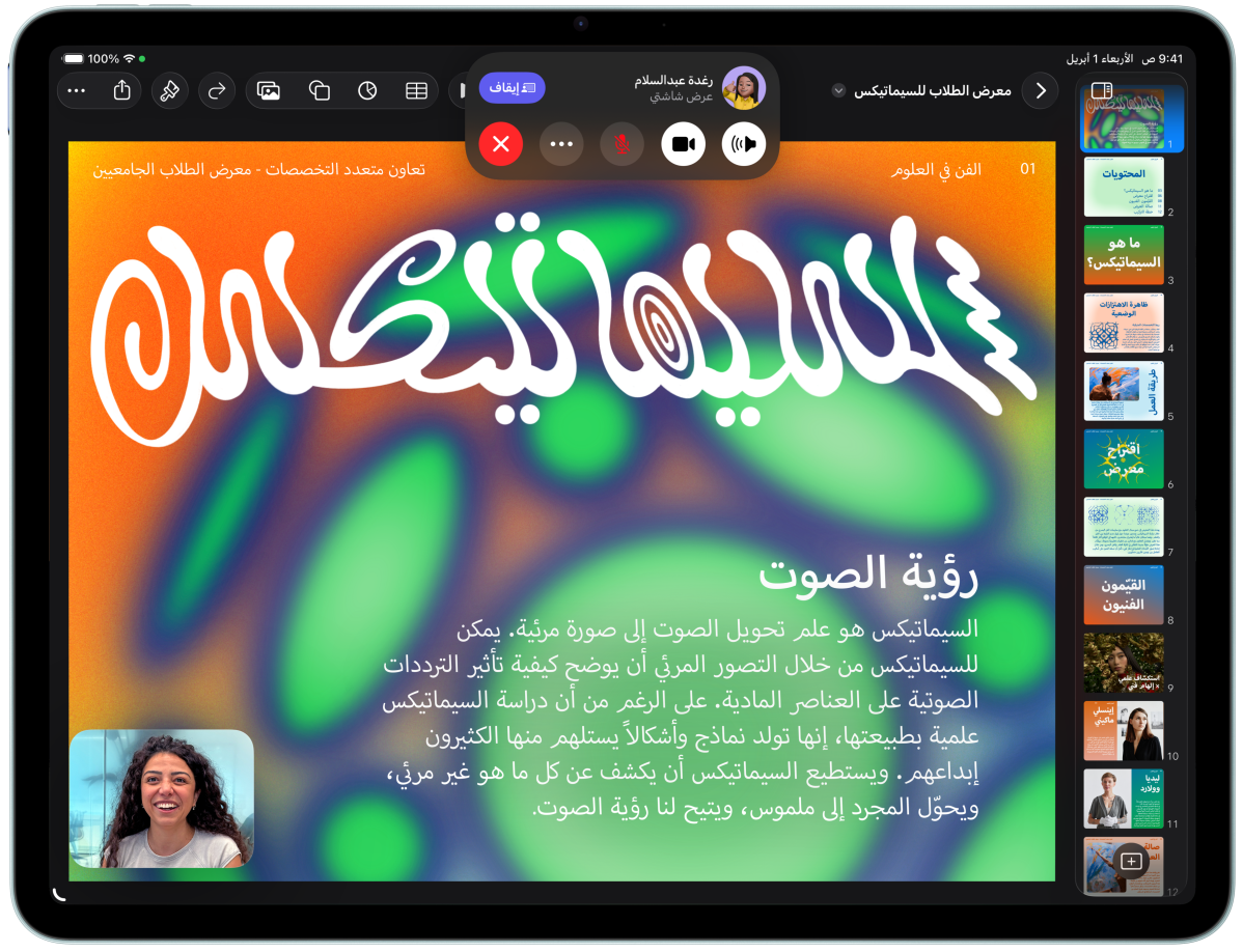 شريحة M4 فائقة السرعة مع ذاكرة نظام موحدة أكبر بنسبة 50 بالمئة ترتقي بالأداء لإنجاز كل ما تحب على iPad Air، فطاقتها الهائلة تطلق العنان لميزات الذكاء الاصطناعي وقدراته التي تستخدمها كل يوم لتنجز المطلوب بسرعة أكبر من دون جهد يذكر. ومع بنية وحدة معالجة رسومات الغرافيك، ستستمتع برسومات غرافيك متطورة أكثر سلاسة في كل ما تقوم به من عمل وإبداع ولعب ومشاهدة. أما البطارية فتواكبك طوال اليوم بكل طاقتها وكفاءتها.4