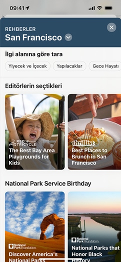 Rehberler, tüm dünyadaki şehirlerde görülecek ve yapılacak muhteşem şeyleri keşfetmenize yardımcı oluyor.4 Özel olarak hazırlanan 1000’e yakın rehbere erişmek ve dikkatinizi çekenleri bulup kaydetmek için Rehberleri Keşfet düğmesine dokunmanız yeterli. Özel Düzenlenmiş Rehberler, yeni yerler eklendiğinde otomatik olarak güncelleniyor. Böylece her zaman en yeni önerileri görebiliyorsunuz. Ayrıca dilerseniz kendi Rehberler kategorinizi oluşturup arkadaşlarınız ve ailenizle paylaşabiliyorsunuz.