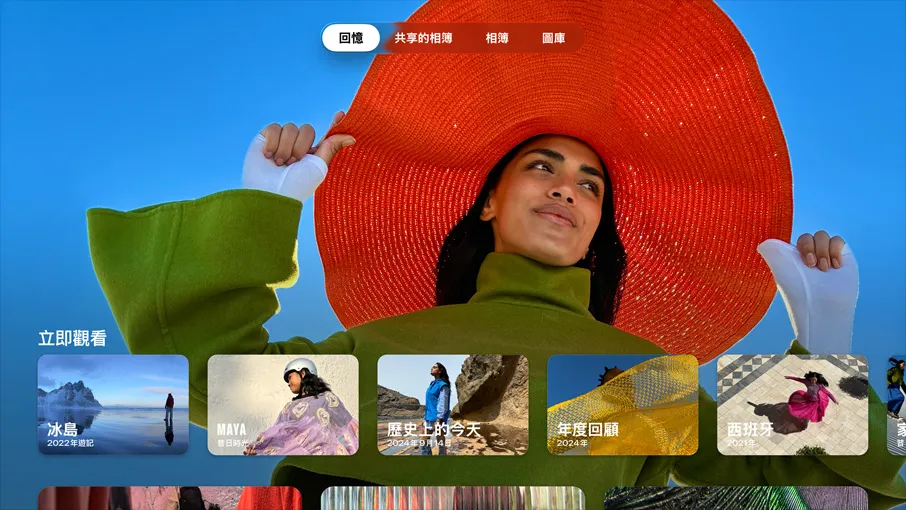 照片。「iCloud 共享的照片圖庫」讓全家人以更輕鬆的方式欣賞彼此的照片,還能直接在你的電視上觀看。你可以選擇「回憶」當作螢幕保護程式,在大螢幕上欣賞躍然重現的珍貴時刻。
