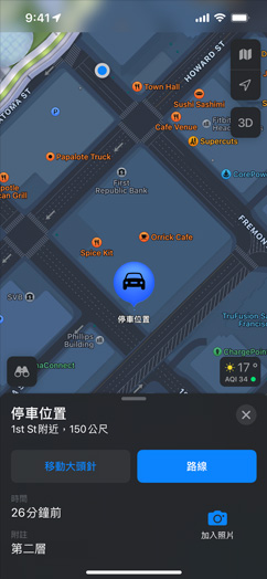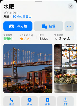 選擇一個目的地,該地點的互動式地點卡便會顯示所有你需要的資訊,一目了然。最基本的包括地址、營業時間、網站和電話號碼等,更有價格範圍、照片圖庫、相關「指南」、接受的付款方式等詳細資訊,甚至連能不能帶寵物都看得到。打開「飛行俯瞰」或「環視」,了解大致的位置和周遭環境。輕點一下,還能快速、安全地租用自行車、付停車費、點餐等。